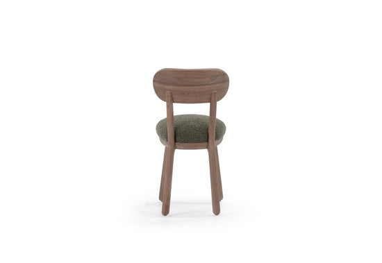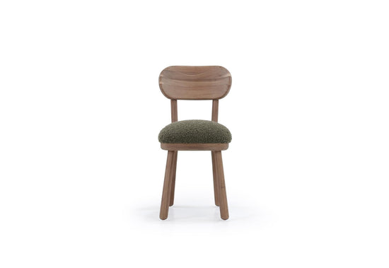 The Coco Dining Chair enchants with its playfully rounded wooden backrest, gently tapered legs, and a plush, inviting seat cushion, creating a harmonious blend of comfort and whimsy.