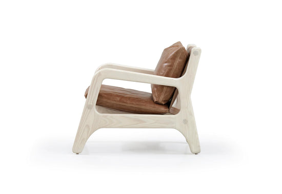 The Forest Sling Chair: soft genuine leather, contrasting heavy double needle stitch detail, and handcrafted walnut frame. Come take a seat - you won't want to get up.