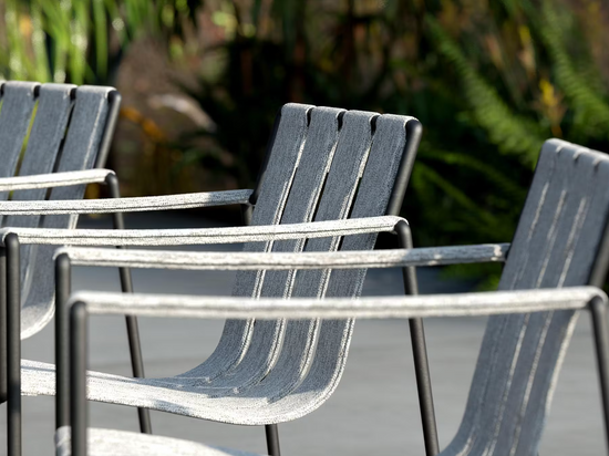 The Strappy line boasts a stainless-steel structure, a continuous rod that creates a sleek, stackable frame, with a visual twist that sees the padded seat straps and armrests seemingly suspended within. This design not only achieves a delicate, refined appearance but also conceals the sturdy aluminum straps that form the chair’s supportive core.